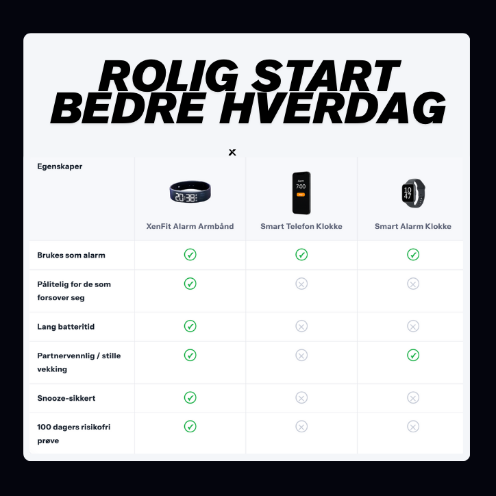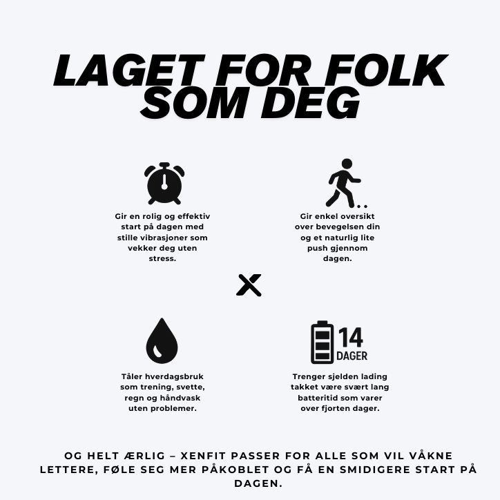 XenFit-alarmen gir deg en rolig og trygg start på dagen. Den vekker deg med behagelige, men effektive vibrasjoner, perfekt for deg som sover tungt og vil stå opp uten stress, uten å vekke partneren.
